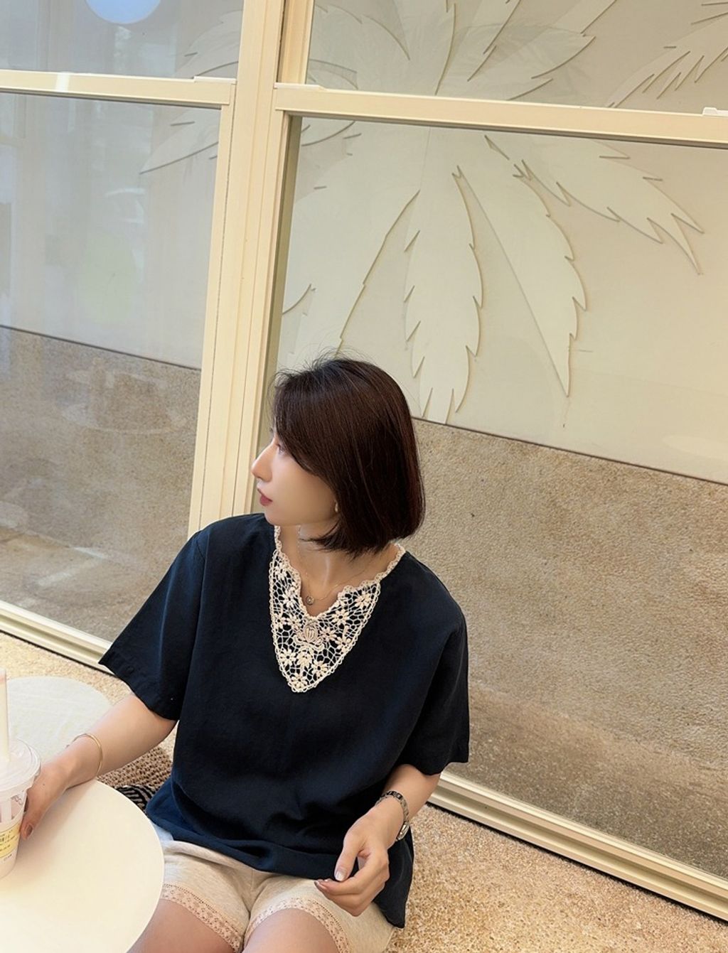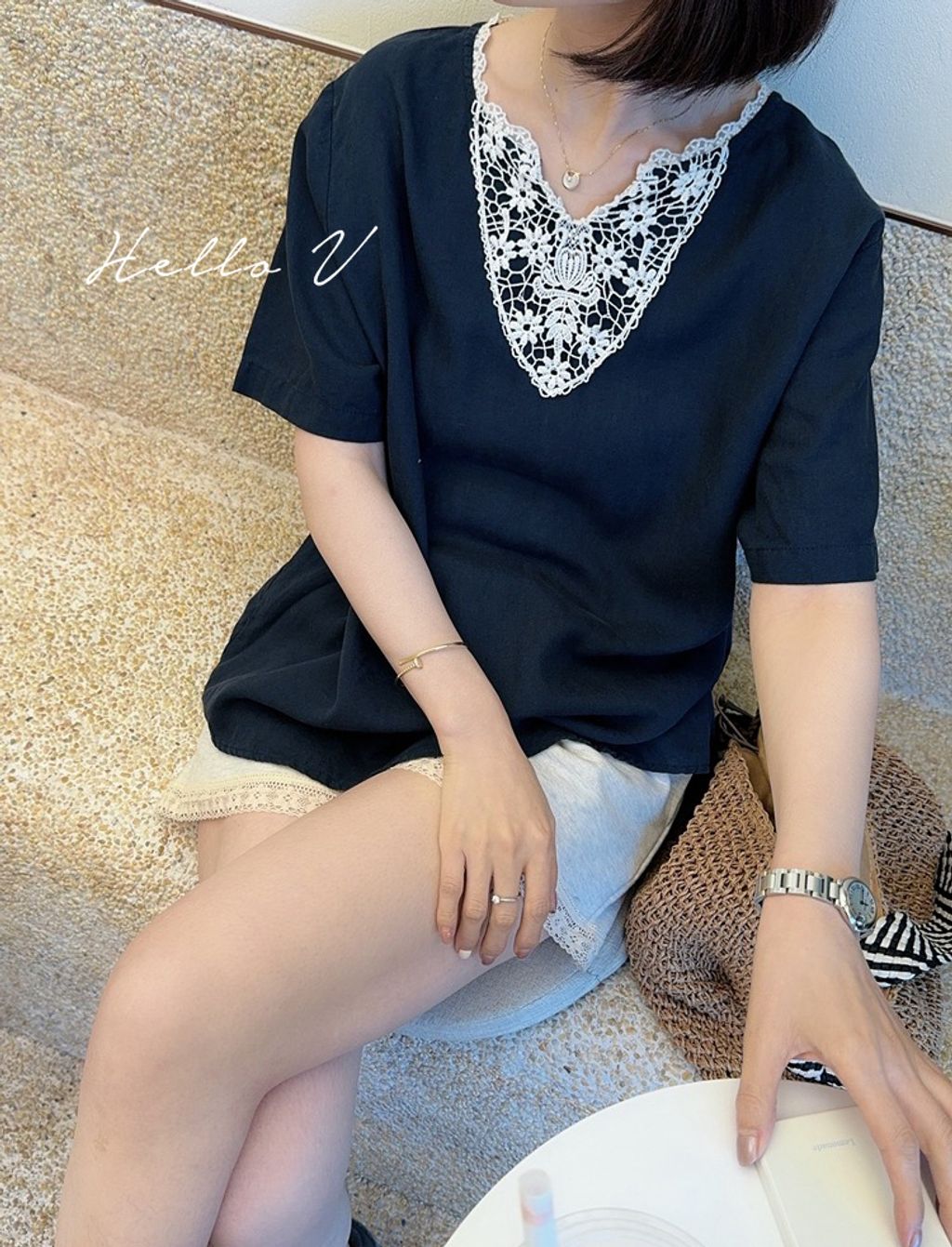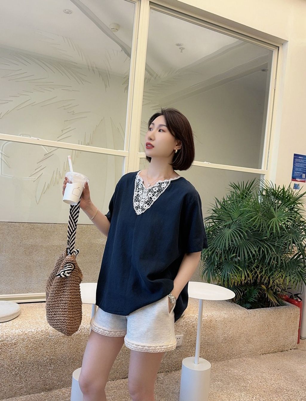 正韓 法式復古優雅蕾絲拼接質感上衣*深藍*【E0710-91】