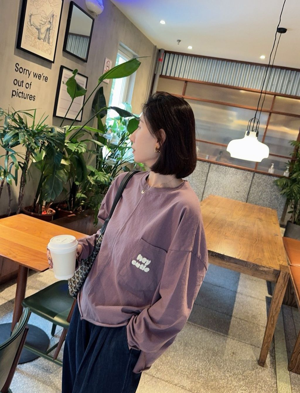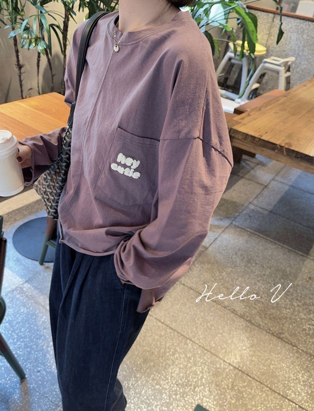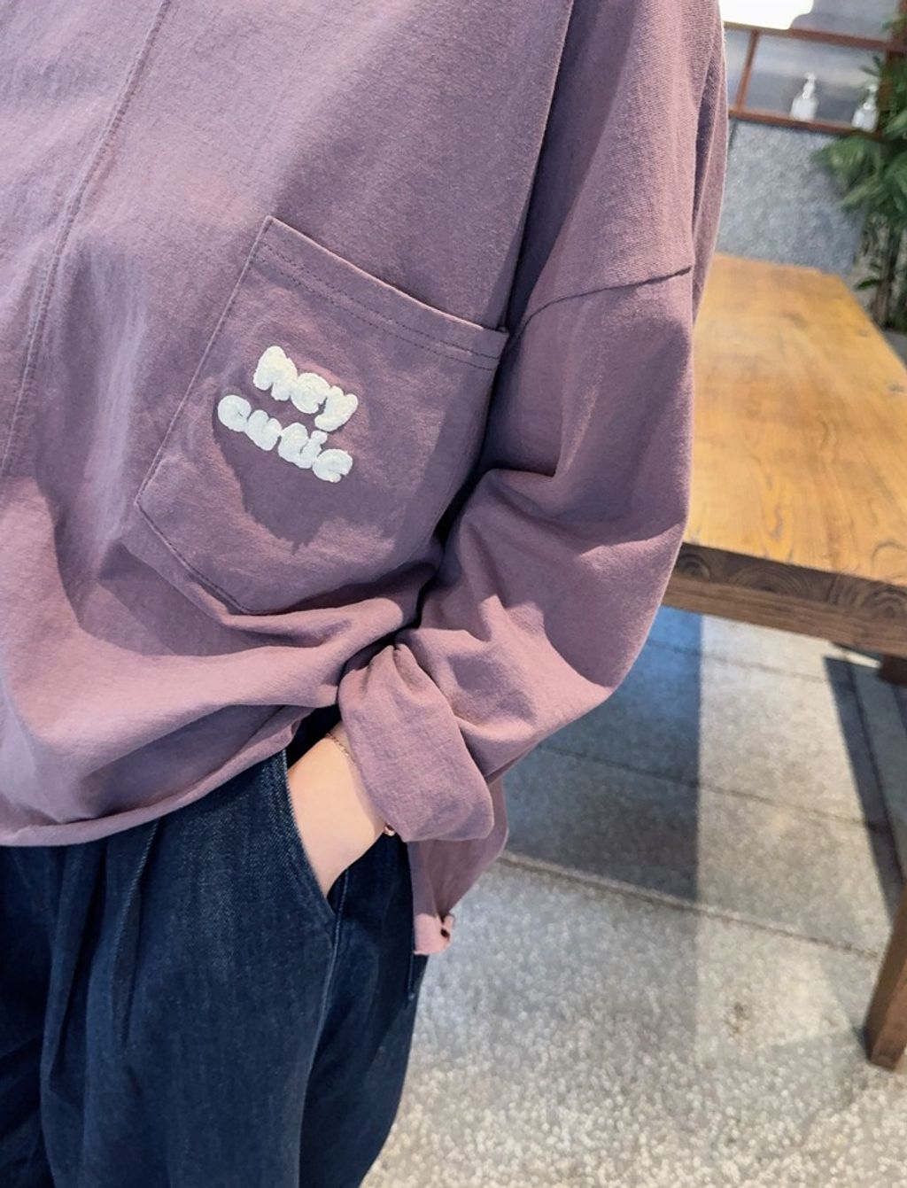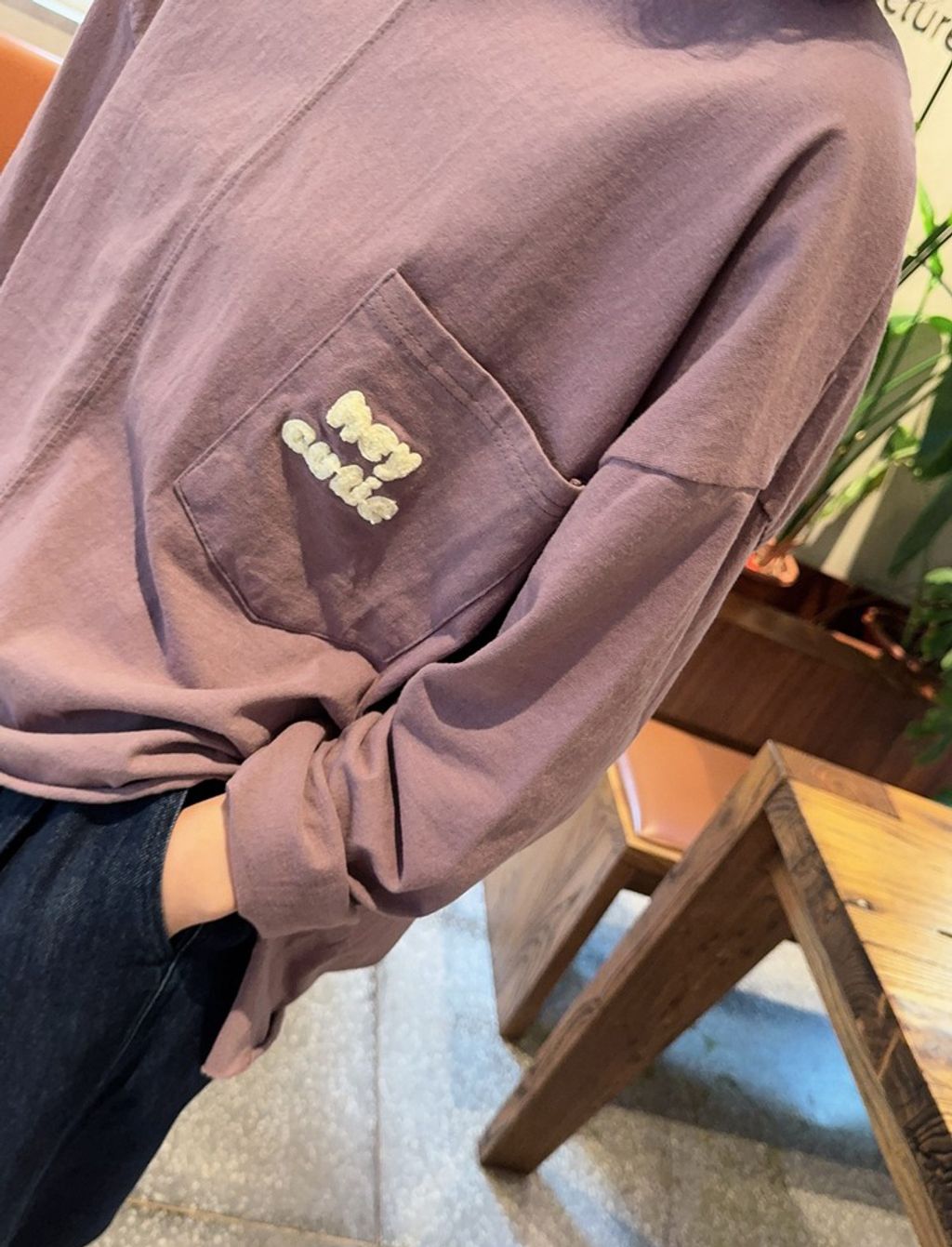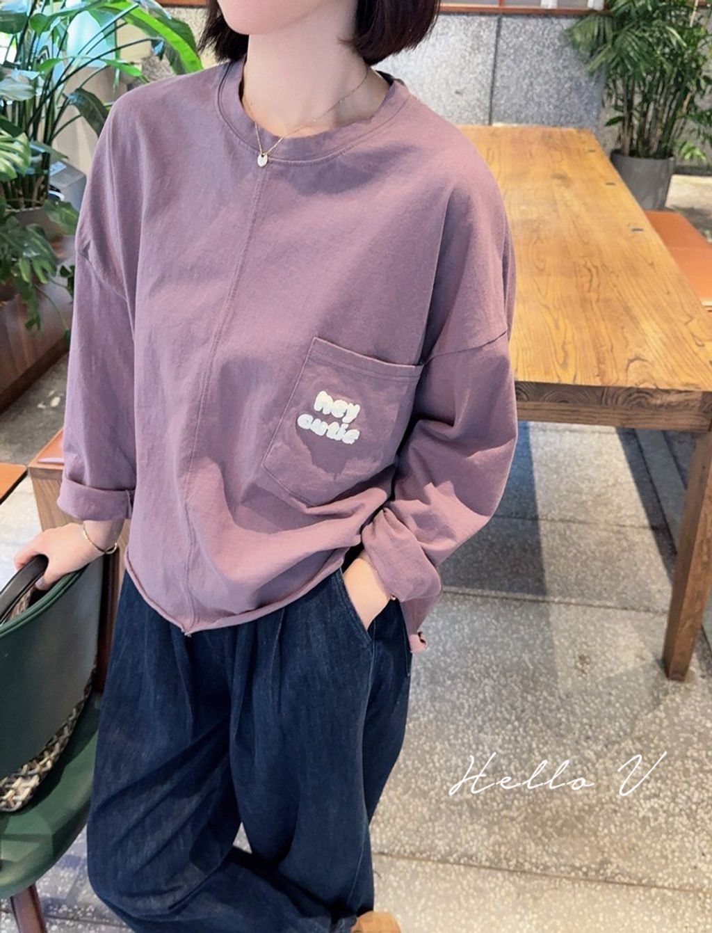 正韓 簡約時尚字母刺繡口袋設計質感長T*紫*【S1105-106】